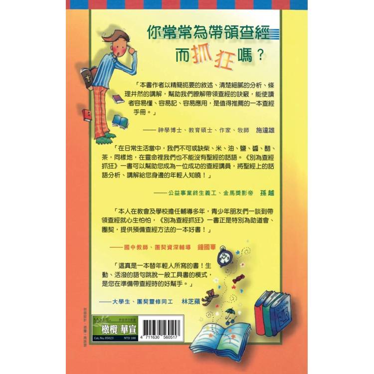 在日常生活當中,我們不可或缺柴、米、油、鹽、醬、醋、茶,同樣地,在靈命裡我們也不能沒有聖經的話語。《別為查經抓狂》一書可以幫助您成為一位成功的查經講員,將聖經上的話語分析、講解給您身旁的青年人知曉!