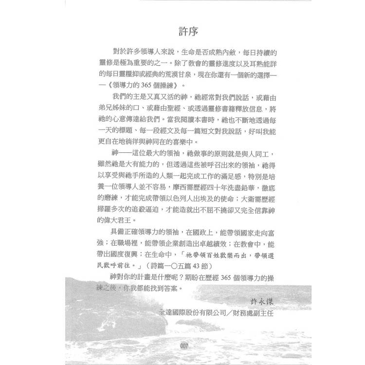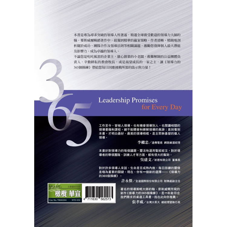 「對於許多領導人來說,生命是否成熟內斂,每日持續的靈修是極為重要的關鍵。現在,你有一個新的選擇 —《領導力的365個操練》。」——許永傑,全達國際股份有限公司財務處副主任