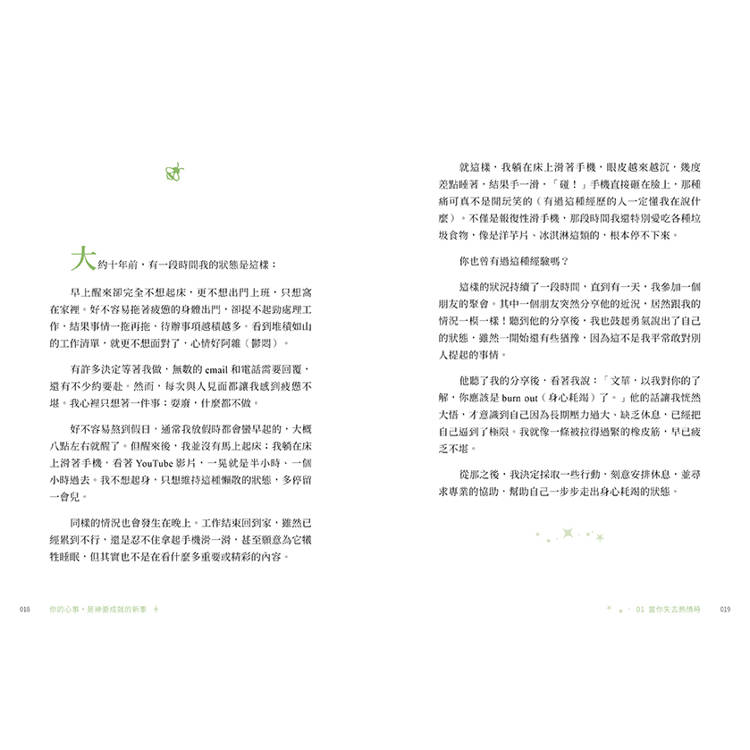 過去的我,總是相信樂觀、熱情、信心與努力就可以克服一切的難關。為自己設定一個又一個越來越高的目標,然後全力朝著目標直奔。成就導向又完美主義的我不只不照顧自己身體,也忙得沒時間靜下來傾聽內在的聲音。我對自己的情緒和情感陌生,甚至否定自己情緒和情感的重要。