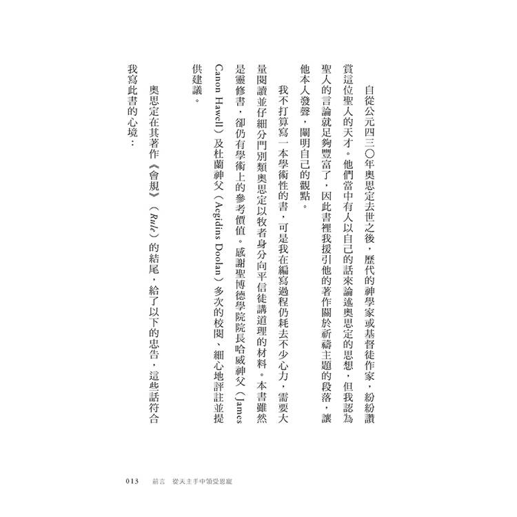 我不打算寫一本學術性的書,可是我在編寫過程仍耗去不少心力,需要大量閱讀並仔細分門別類奧思定以牧者身分向平信徒講道理的材料。本書雖然是靈修書,卻仍有學術上的參考價值。感謝聖博德學院院長哈威神父(James Canon Hawell)及杜蘭神父(Aegidins Doolan)多次的校閱、細心地評註並提供建議。