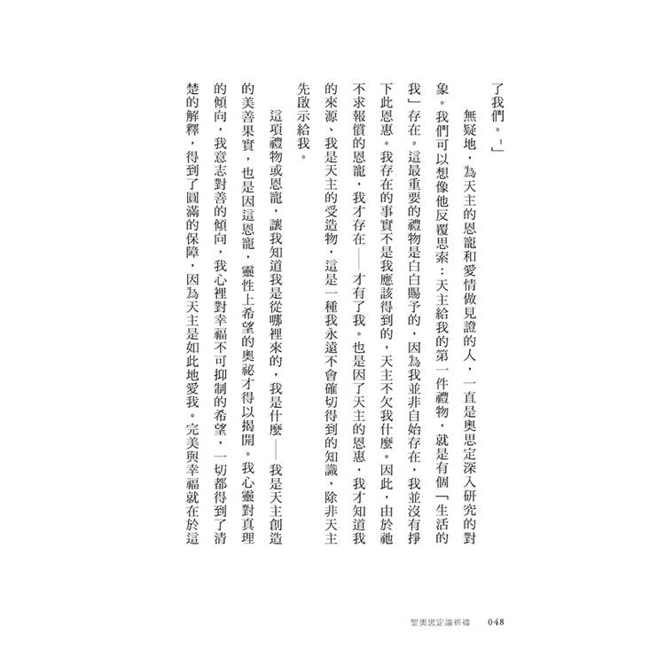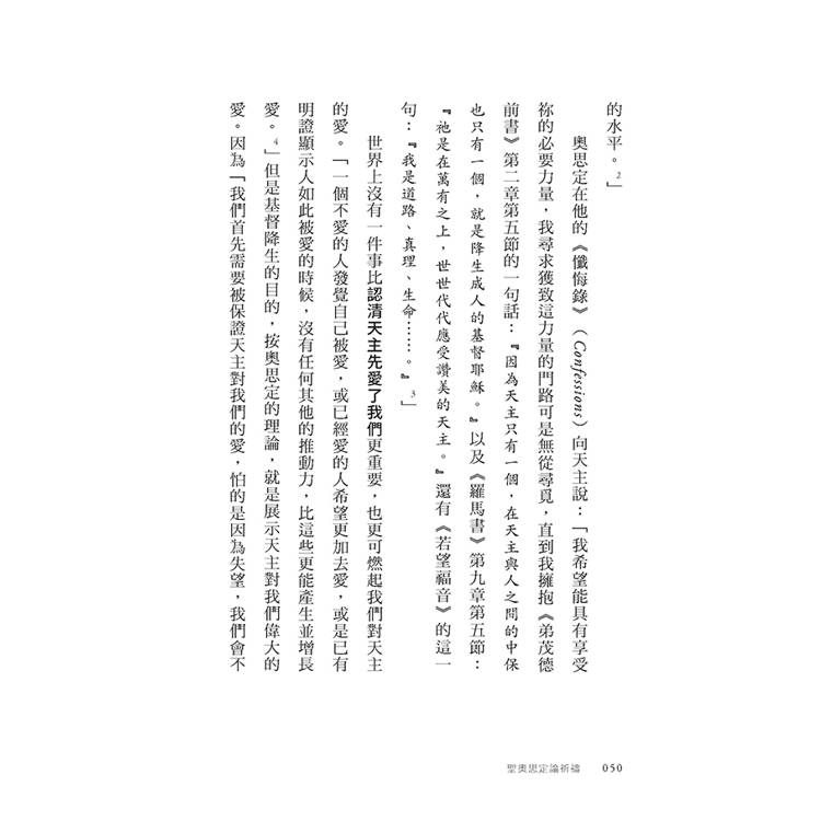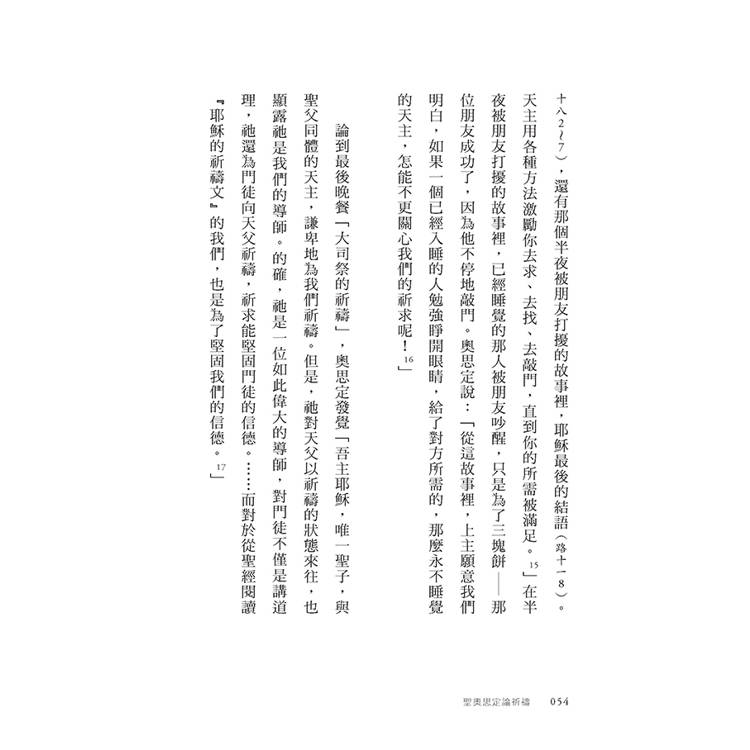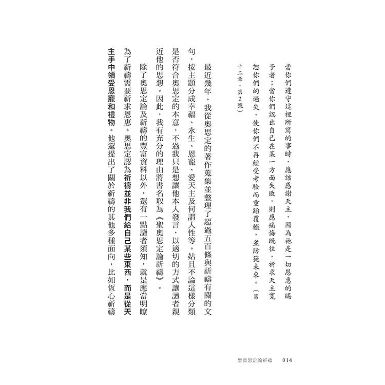 自從公元四三○年奧思定去世之後,歷代的神學家或基督徒作家,紛紛讚賞這位聖人的天才。他們當中有人以自己的話來論述奧思定的思想,但我認為聖人的言論就足夠豐富了,因此書裡我援引他的著作關於祈禱主題的段落,讓他本人發聲,闡明自己的觀點。