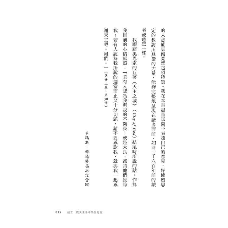 除了奧思定論及祈禱的豐富資料以外,還有一點讀者須知,就是應當明瞭為了祈禱需要祈求恩惠。奧思定認為祈禱並非我們給自己某些東西,而是從天主手中領受恩寵和禮物。他還提出了關於祈禱的其他多種面向,比如恆心祈禱的人必能具備寬恕這項特質。我在本書盡量試圖不表達自己的意見,好使奧思定的教誨所具備的力量,能夠完整地呈現在讀者面前,如同一千六百年前的讀者或聽眾一樣。