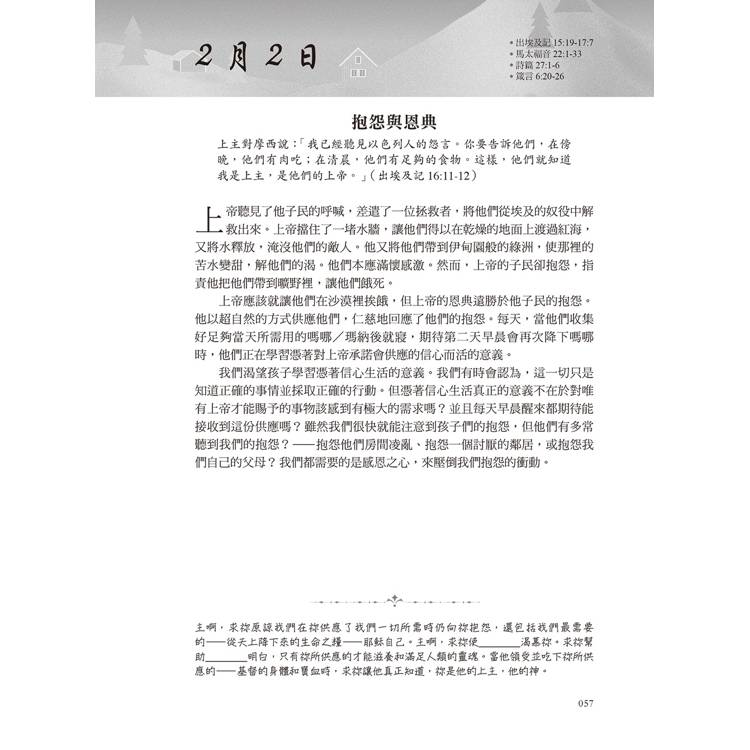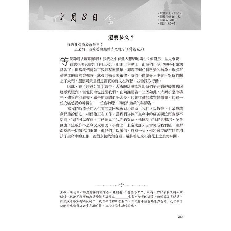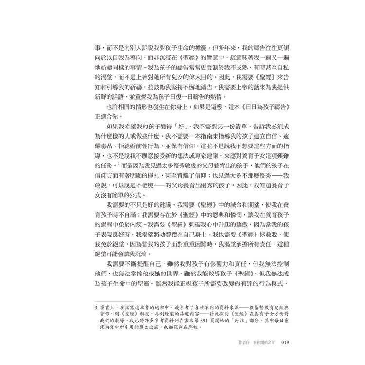我在一次婦女大會上贏得了這本書。我沒想到它會給我帶來如此巨大的祝福。它提醒我聖經中適用於所有孩子的真理——無論年齡、成長階段或靈性狀態如何。我把它當作禮物送給了別人,也推薦給了很多人。我很高興每天都能讀到它,因為對孩子的焦慮總是會悄悄襲來,而我們作為信徒,需要被提醒上帝的主權和應許。它給了我極大的平安。──美國讀者Sue*******