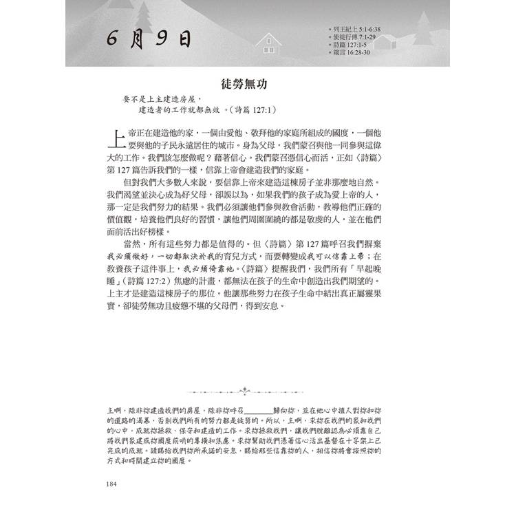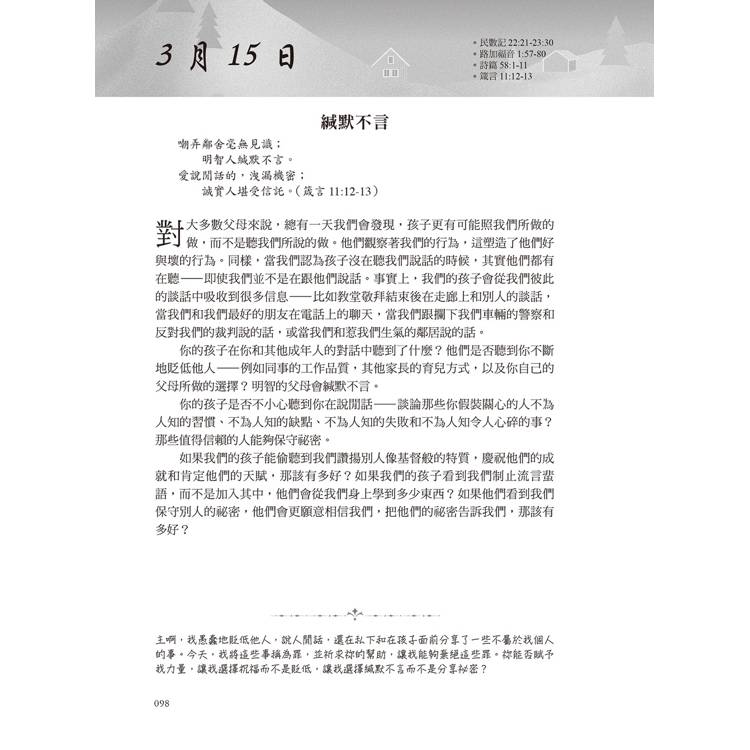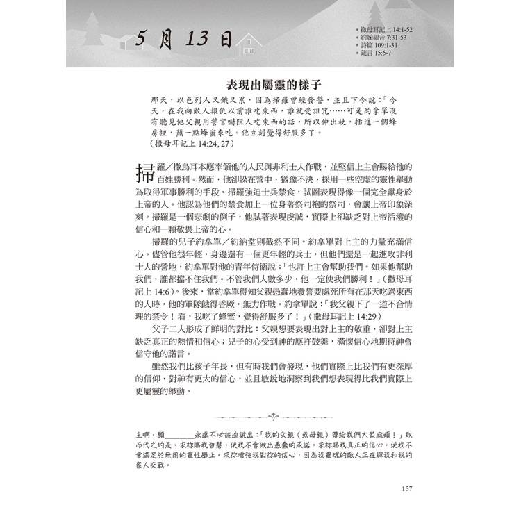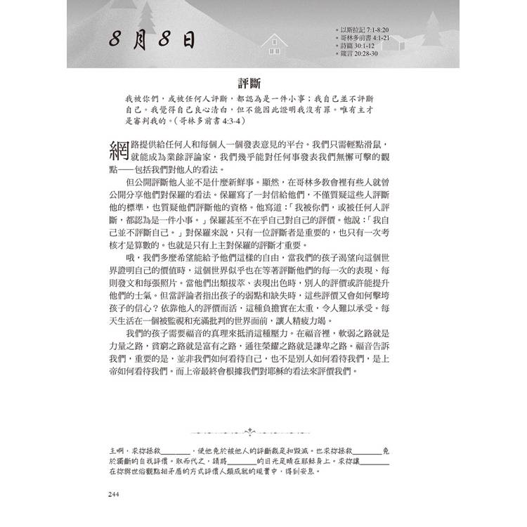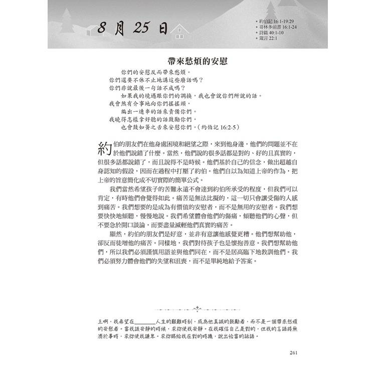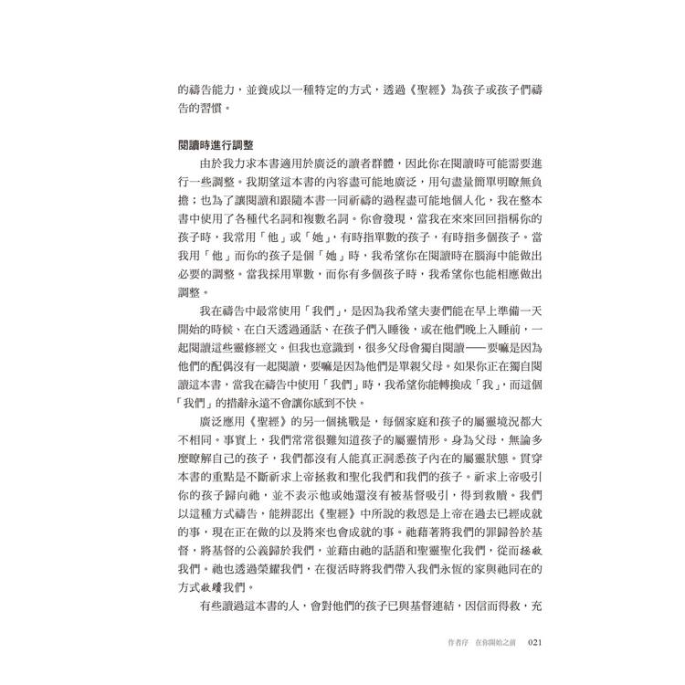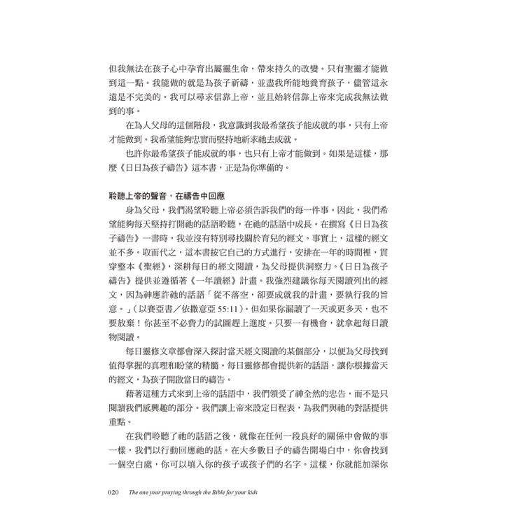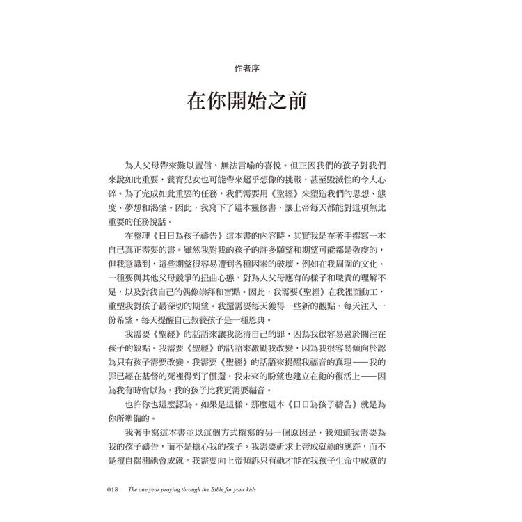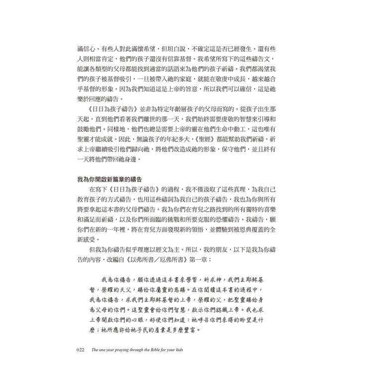 這本書每天都會提供一節經文供閱讀,然後會有一個禱告。有時候,我不知道該如何為孩子禱告,以及禱告什麼時,這本書幫助我學會如何具體地為他們禱告。──美國讀者Lau*********