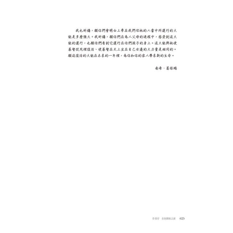 這本書不是講大道理,而是每天用一節經文、一段反思、一個禱吿,陪著父母重新學會交託。它讓我們從「想要改變孩子」轉變成「先被神改變」;從「擔心孩子會不會出問題」變成「相信神正在動工」。當我們的禱吿越來越多,焦慮就越來越少,心也會越來越平安。因為眞正能守護孩子一生的,不是我們的經驗,而是神的恩典。