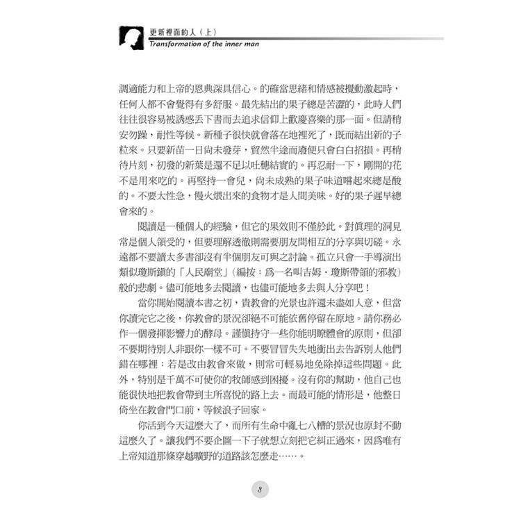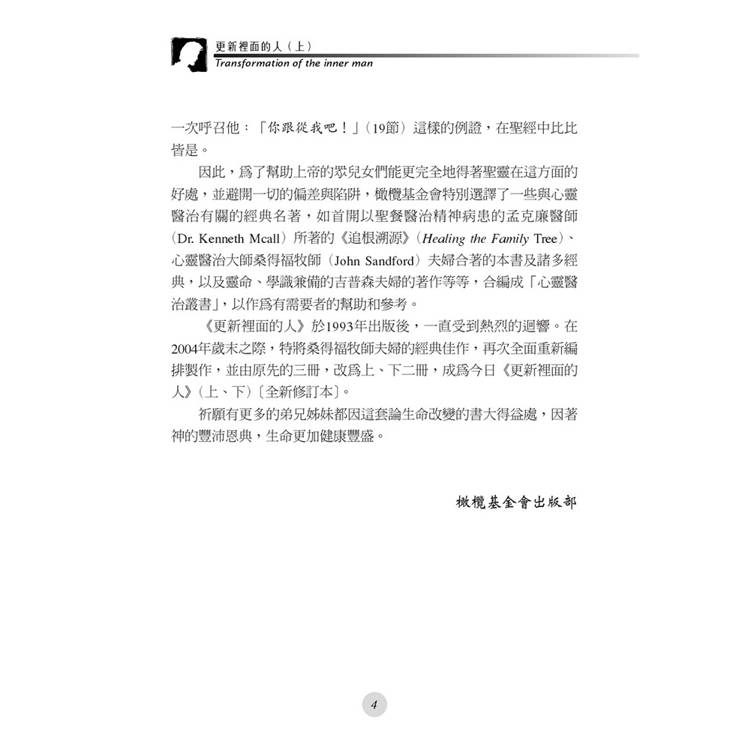 《更新裡面的人》於1993年出版後,一直受到熱烈的迴響。在2004年歲末之際,特將桑得福牧師夫婦的經典佳作,再次全面重新編排製作,並由原先的三冊,改為上、下二冊,成為今日《更新裡面的人》(上、下)〔全新修訂本〕。