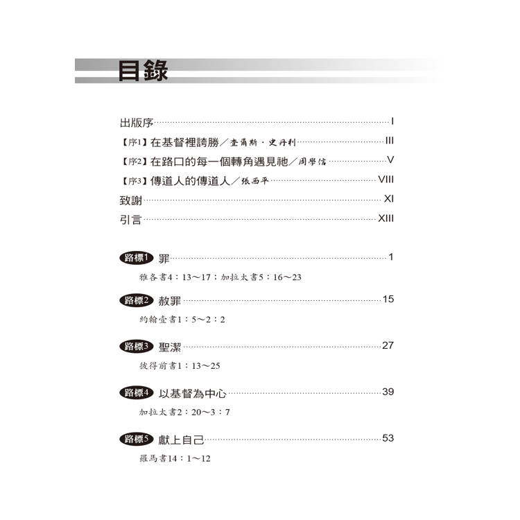 ◎在這本書中,每一個根據聖經所描述的的路標,都為每一個在危機中所做的決定負責—那是一種選擇;如果您駕駛得當,它將能引領你在靈性旅程中不斷地前進。本書所強調的乃在於,惟有藉著聖靈的力量邁向成聖大道,信徒們才有可能更深地進到神所為他們設定的神聖目的中,這可能也是本書最有價值的貢獻。