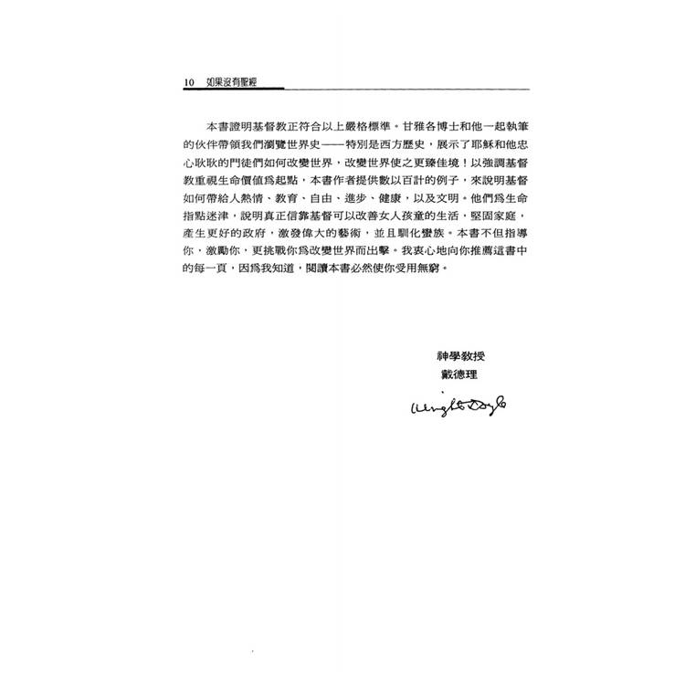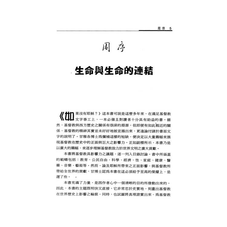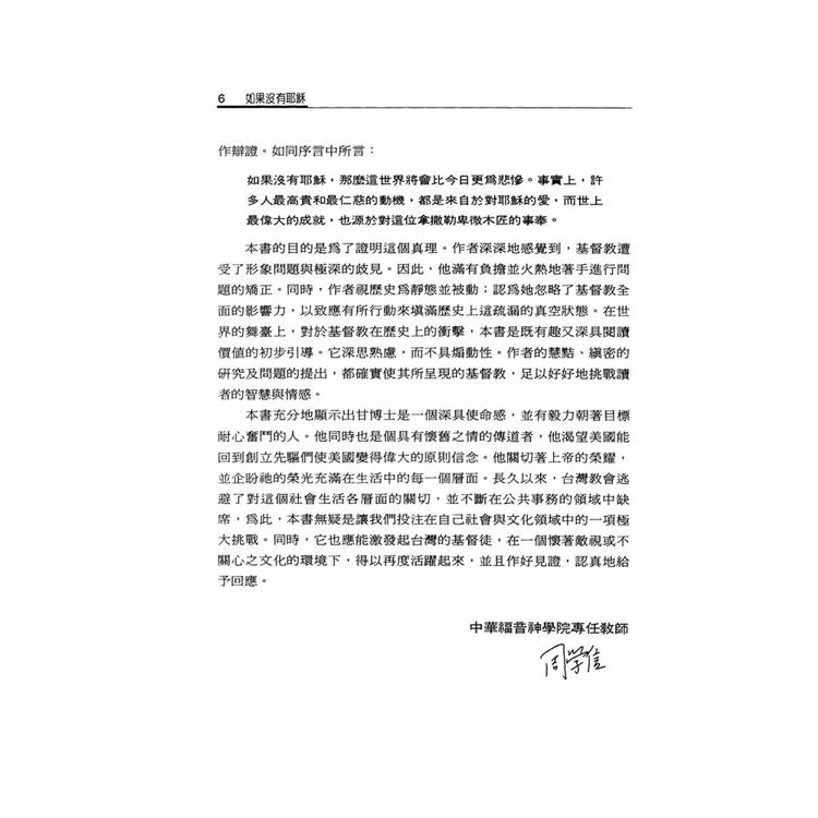 《如果沒有耶穌?》這本書可說是這麼多年來,在滿足基督教文字事工上,一本必備且對讀者十分具有助益的書。雖然,基督教與西方歷史之關係有很深的淵源,但即便有如此親近的關係,基督教的精神其實並未好好地被宣揚出來,更遑論付諸於書面文字的說明了。甘雅各博士為彌補這樣的短缺,便決定以大量篇幅來展現基督教在歷史中的正面與巨大之影響力。正如副標所示,本書乃是以廣大的篇幅,來逐步理解基督教致力於世界文明之廣大貢獻。