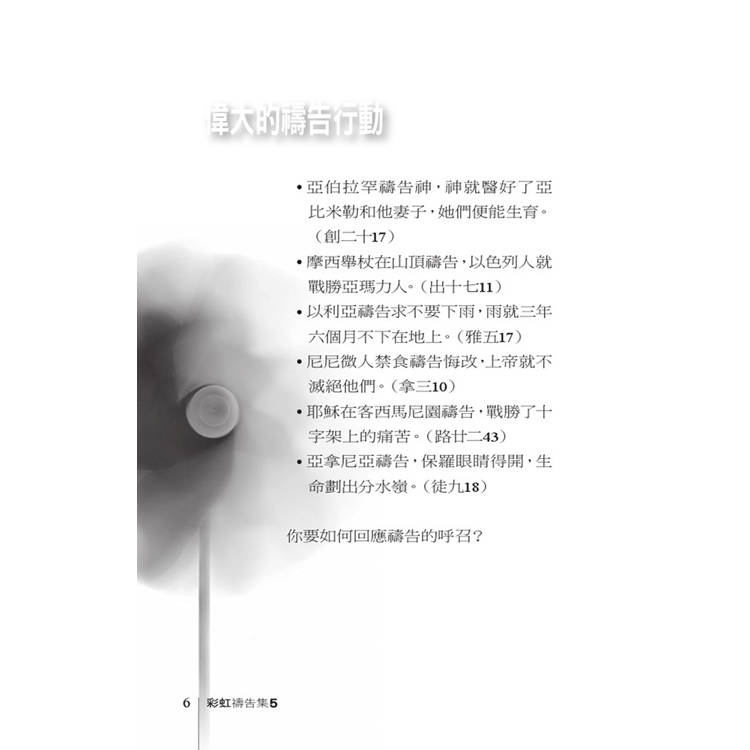 禱告是每一個基督徒信主以後的基本功課。為了幫助剛信主的基督徒,在初信的起步時,就開始過禱告的生活;或還沒有從禱告中、經歷神的老基督徒養成禱告的習慣,這一套禱告集的設計很生活化。每一本禱告小冊,有四十九篇禱文,分屬不同主題;每一篇禱文包含:讀經、經文、禱文、默想或心得;每本禱告小冊均可反覆使用。