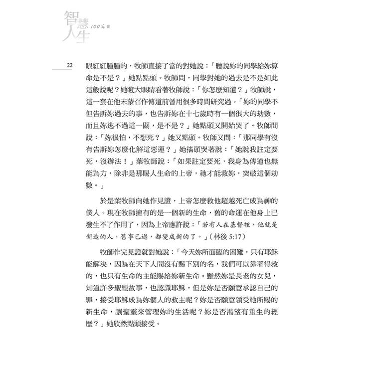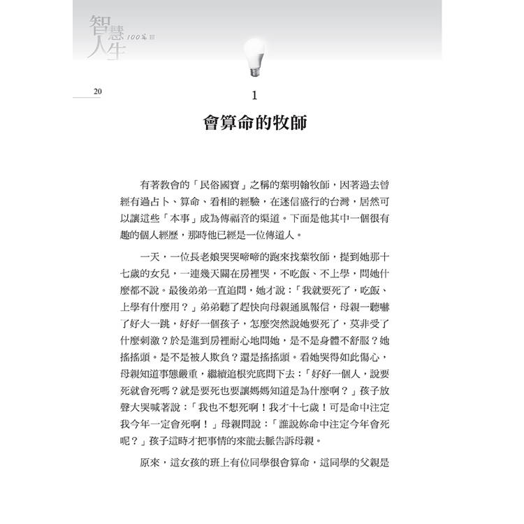 自《智慧人生100 篇(I)》和《智慧人生100 篇(II)》問世以來,我收到不少讀者的回饋,有人說這些文章陪伴他們度過低潮,有人說其中的故事啟發了他們對信仰與生命的新理解,也有人說,每天翻一篇,就是靈魂的補給。