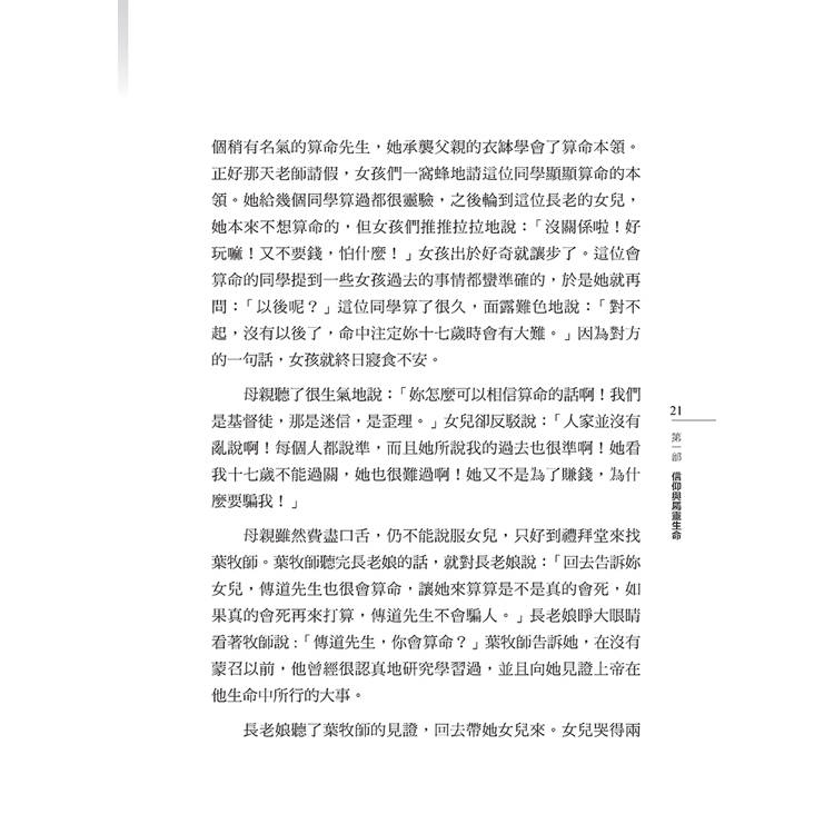 母親聽了很生氣地說:「妳怎麼可以相信算命的話啊!我們是基督徒,那是迷信,是歪理。」女兒卻反駁說:「人家並沒有亂說啊!每個人都說準,而且她所說我的過去也很準啊!她看我十七歲不能過關,她也很難過啊!她又不是為了賺錢,為什麼要騙我!」