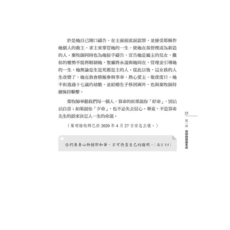 人生有時像一場考試,有時像一場漫長的等待;有時我們需要神蹟,有時我們連「為什麼」都得不到答案。但願這本書,能陪你走過那些沉默的時刻,引領你看見,在困惑中仍有信心,在流淚中仍能微笑。