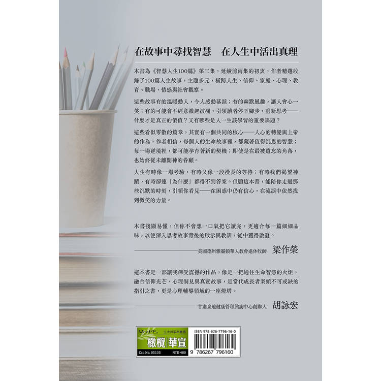 本書為《智慧人生100篇》第三集,延續前兩集的初衷,作者精選收錄了100篇人生故事,主題多元,橫跨人生、信仰、家庭、心理、教育、職場、情感與社會觀察。