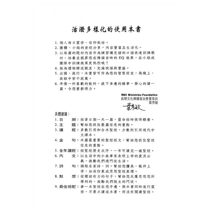 ◆ 搭配:一邊閱讀聖經本文,一邊享受靈命日糧,天天與神同在同行。