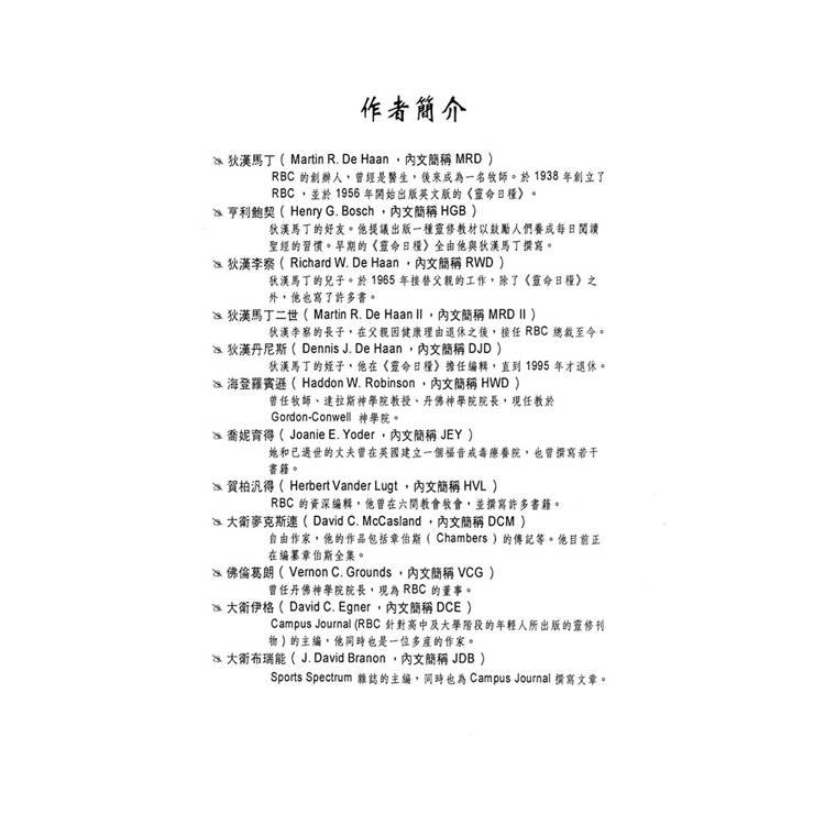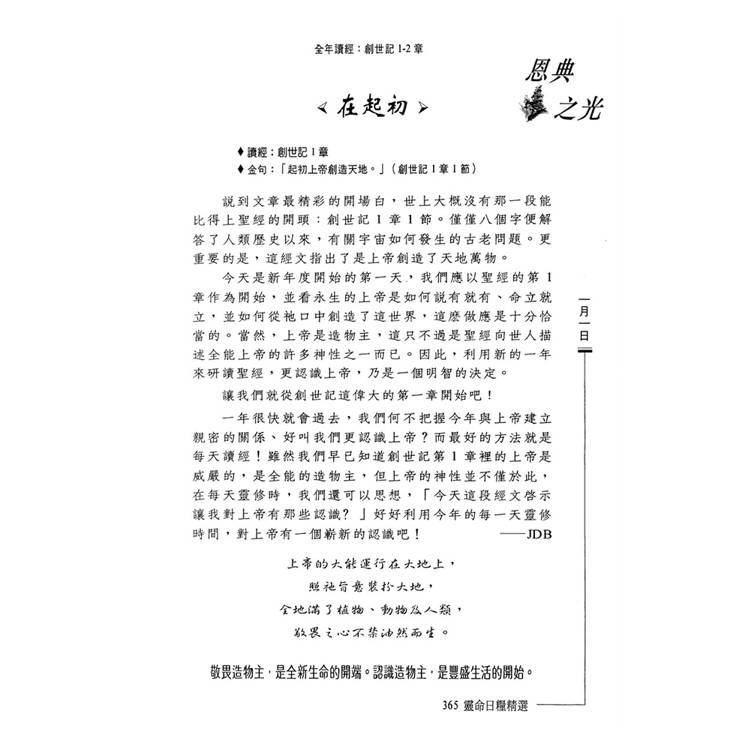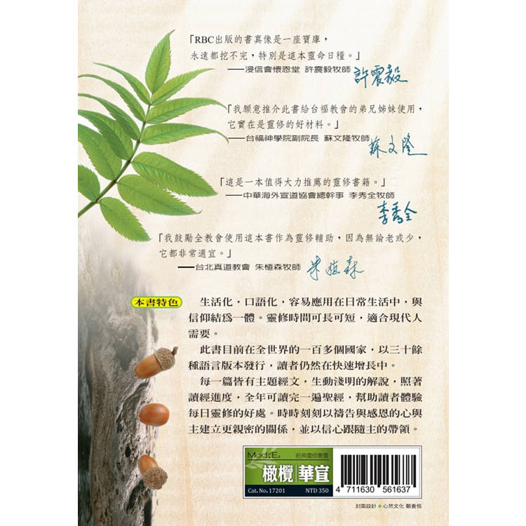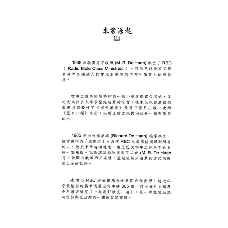 本書乃RBC與橄欖出版社共同合作出版,將近來最精彩的篇章慎選出其中的365篇,訂出每月主題及全年讀經進度(一年剛好讀完一遍),是一本能幫助您將信仰與生活結為一體的靈修好書。