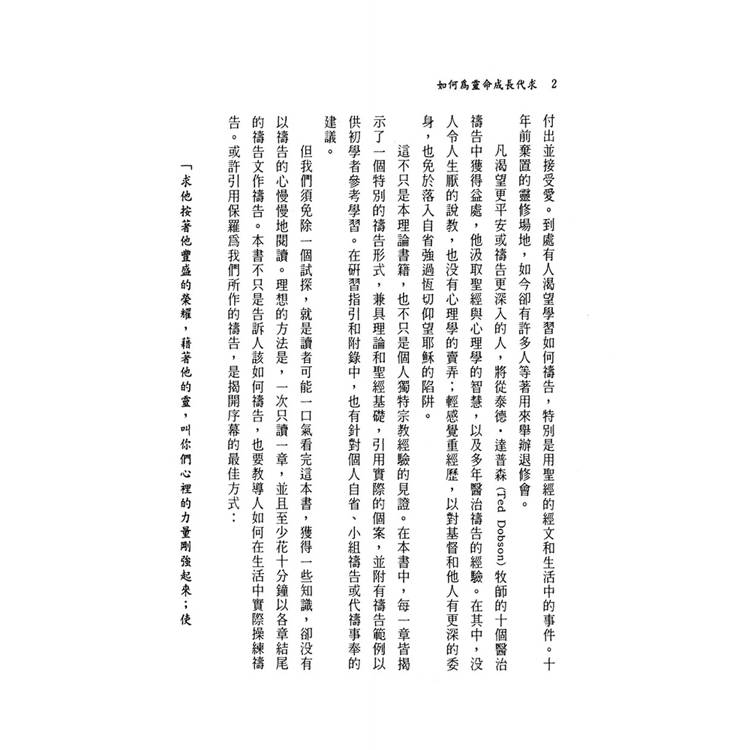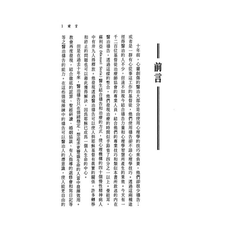 作者分別就找尋真正的自我、釋放真我、醫治記憶等三方面來介紹十種內在醫治的禱告方式,以幫助讀者找尋、釋放自我並醫治記憶中所帶來的傷害,藉此獲得屬靈的成長和更健全的生命內涵。