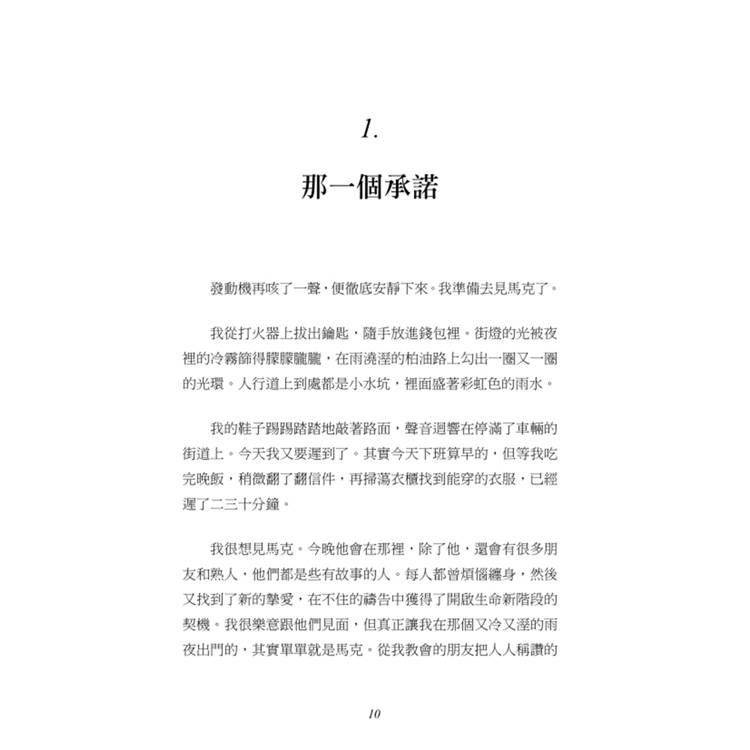 馬克擅於傾聽,也總能找到合適的時機分享自己的所思所得。他使我嘗試從陌生的角度去觀察這個世界,在熙熙攘攘的人群中尋找能夠長久存在的東西。我被馬克所吸引,但我心裡總覺得有什麼東西阻擋在我們之間,使我們永遠保持禮貌的距離。馬克問過我幾次是否願意和他在一起,我很想答應,然後,我就能和他一起吃著甜點、喝著暖熱的咖啡、舒舒服服地聊天了。我很想跟他一起出去,但我似乎總是沒辦法找到時間跟他見面。我期待我們可以一起去街角公園餵鴨子、聽著他爽朗的笑聲,但這些渴望總是被來自往日的回音淹沒,它們一遍遍地重現,提醒著我多年前許下的一個承諾。