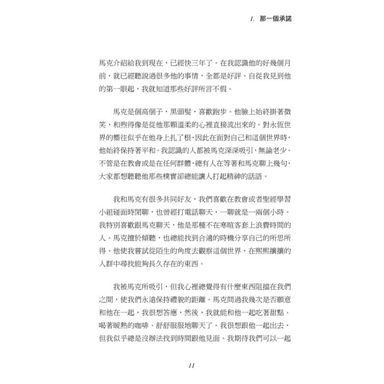 今天我又要遲到了。其實今天下班算早的,但等我吃完晚飯,稍微翻了翻信件,再掃蕩衣櫃找到能穿的衣服,已經我很想見馬克。今晚他會在那裡,除了他,還會有很多朋友和熟人,他們都是些有故事的人。每人都曾煩惱纏身,然後又找到了新的摯愛,在不住的禱告中獲得了開啟生命新階段的契機。我很樂意跟他們見面,但真正讓我在那個又冷又溼的雨夜出門的,其實單單就是馬克。從我教會的朋友把人人稱讚的馬克介紹給我到現在,已經快三年了。在我認識他的好幾個月前,就已經聽說過很多他的事情,全都是好評。