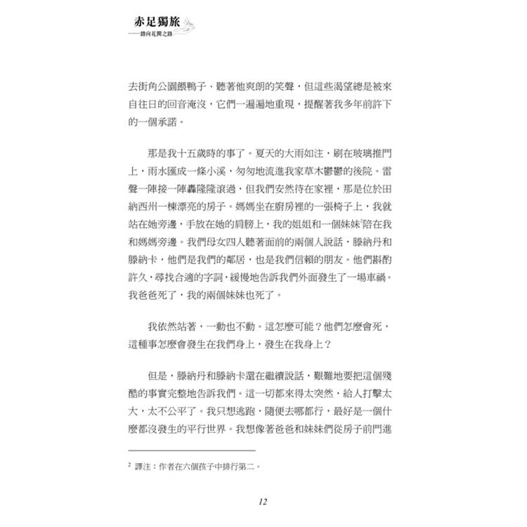 那是我十五歲時的事了。夏天的大雨如注,刷在玻璃推門上,雨水匯成一條小溪,匆匆地流進我家草木鬱鬱的後院。雷聲一陣接一陣轟隆隆滾過,但我們安然待在家裡,那是位於田納西州一棟漂亮的房子。媽媽坐在廚房裡的一張椅子上,我就站在她旁邊,手放在她的肩膀上,我的姐姐和一個妹妹陪在我和媽媽旁邊。我們母女四人聽著面前的兩個人說話,滕納丹和滕納卡,他們是我們的鄰居,也是我們信賴的朋友。他們斟酌許久,尋找合適的字詞,緩慢地告訴我們外面發生了一場車禍。我爸爸死了,我的兩個妹妹也死了。