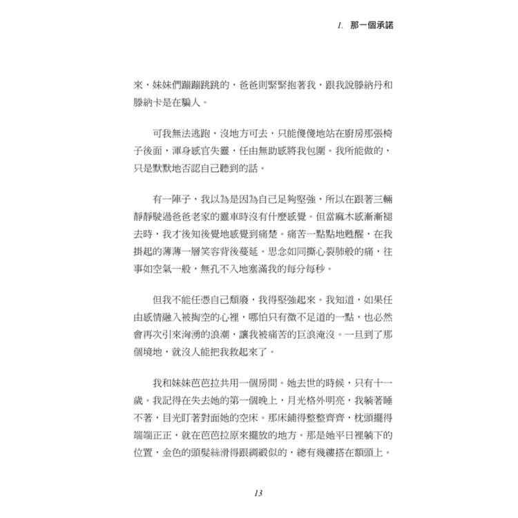 我依然站著,一動也不動。這怎麼可能?他們怎麼會死,這種事怎麼會發生在我們身上,發生在我身上?但是,滕納丹和滕納卡還在繼續說話,艱難地要把這個殘酷的事實完整地告訴我們。這一切都來得太突然,給人打擊太大,太不公平了。我只想逃跑,隨便去哪都行,最好是一個什麼都沒發生的平行世界。我想像著爸爸和妹妹們從房子前門進來,妹妹們蹦蹦跳跳的,爸爸則緊緊抱著我,跟我說滕納丹和滕納卡是在騙人。可我無法逃跑,沒地方可去,只能傻傻地站在廚房那張椅子後面,渾身感官失靈,任由無助感將我包圍。我所能做的,只是默默地否認自己聽到的話。