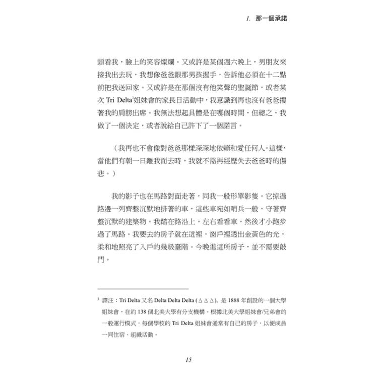 兩年後,喪親之痛終於不可抑制地噴湧而出,化作姍姍來遲的淚水。悲傷如潮水般湧來,擊打在我不堪重負的心上。我只能想到一個法子來擺脫這要命的處境:我給了自己一個承諾。我不太確定這具體是什麼時候的事。可能是在畢業典禮上,當我走上舞臺的時候我渴望見到爸爸,我想像他從照相機後方抬頭看我,臉上的笑容燦爛。又或許是某個週六晚上,男朋友來接我出去玩,我想像爸爸跟那男孩握手,告訴他必須在十二點前把我送回家。又或許是在那個沒有他笑聲的聖誕節,或者某次 Tri Delta姐妹會的家長日活動中,我意識到再也沒有爸爸摟著我的肩膀出席。我無法想起具體是在哪個時間,但總之,我做了一個決定,或者說給自己許下了一個諾言。(我再也不會像對爸爸那樣深深地依賴和愛任何人。這樣,當他們有朝一日離我而去時,我就不需再經歷失去爸爸時的傷悲。)