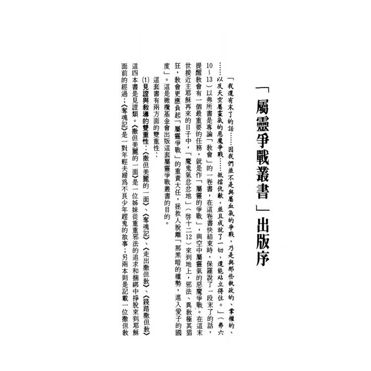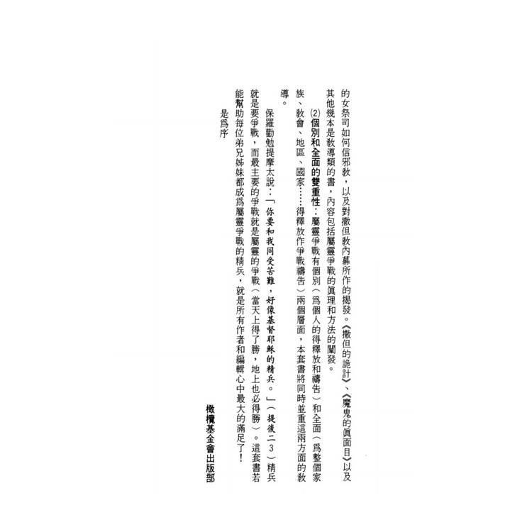 從中您將得知:如何得勝地抵擋撒但;如何應對險詐的「新時代」教義;如何辨識並對付撒但教的虐待孩童儀式;如何在從撒但權下得釋放的地區服事;如何處理得釋放後的人們所要面對的特殊問題等等。