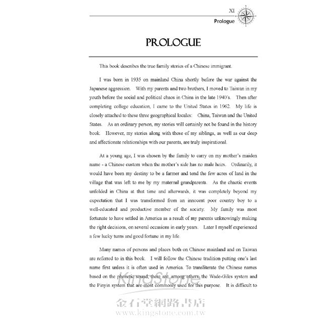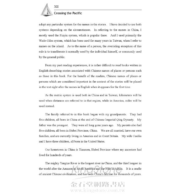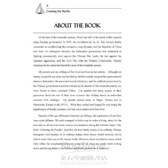 Because of the age differences between our siblings, the experiences of our lives were quite different. We each managed to find a way to make a living, strive for the best and we all survived under various circumstances during the turbulent times. This book "Crossing the Pacific" describes the true family stories of an ordinary Chinese immigrant. Just because of its ordinary nature, these stories would certainly not be able to make their way to the history books. However, these true family stories which fully reflect the complicated historical events of our times are surely worth writing down and leaving them to our children and future generations in America!