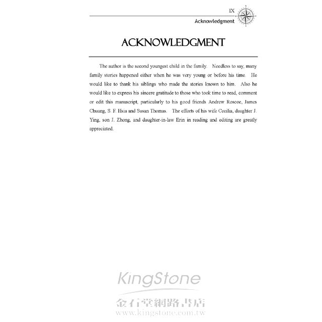 The family referred to in this book began with my grandparents. They had five children, all born in China at the end of Chinese Imperial Qing Dynasty. My father was the youngest. They were all long gone years ago. My parents also had five children, all born in Hubei Province, China. We are all married, have our own families, and are currently living in America and in Great Britain. My wife Cecilia and I have three children, all born in the United States.