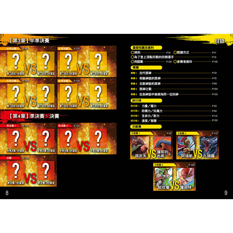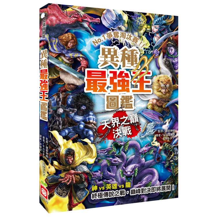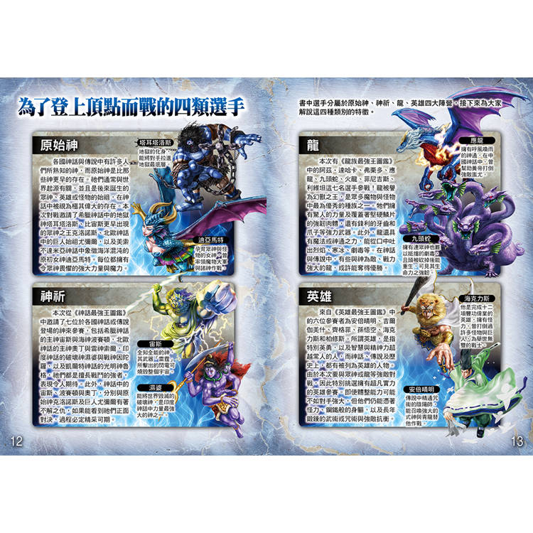 之前,曾經舉辦過「神話最強王」、「英雄最強王」、「龍族最強王」等王者選拔淘汰賽,而參賽的選手們,除了具備極佳的戰鬥能力,有些還能使用魔法或特殊武器,讓每場比賽都精采萬分、毫無冷場,所有人都看得目不轉睛。雖然比賽結束了,但仍止不住人們的好奇心,想著:「如果讓神、英雄、龍決鬥的話,誰會是最強的呢?」這個問題不論怎麼想都不會有答案,還是要比了才知道。因此,我們再次邀請了二十四位強者,舉辦盛大的對戰淘汰賽,而且,這次還有未曾參賽過的「原始神」加入,祂們可是比宙斯等天神更古老的存在,想必會有更厲害的戰鬥招式出現吧?在這場世紀決戰中,究竟誰會取得最後勝利,完全無法預測,只能在書中一探究竟!