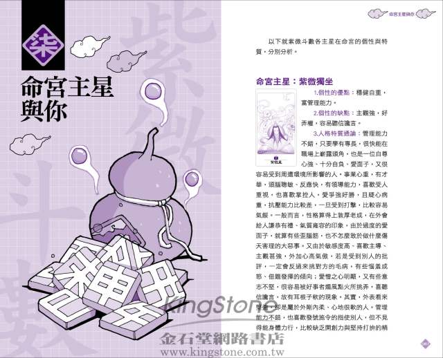 本書針對紫微斗數的幾個面向,包括什麼是紫微斗數、基本名詞釋疑(包括五行、天干、地支、三合、六沖)、命盤、紫微斗數星座主角、吉星與煞星、四化星、命宮主星與你等,藉由淺白的文字搭配命盤,介紹、剖析屬於想認識紫微斗數的你所想知道的所有問題,再經由隨書附贈的排盤命盤光碟、精心製作的紫微牌組及十二宮命盤排盤占卜表,進行排盤、占卜,以找出屬於你的人生運勢、特質,及未來,提供你一個不被宿命套牢、突破自己,找出屬於你的未來命運軌跡。