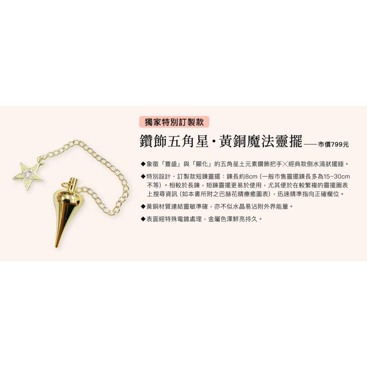  特別設計・訂製款短鍊靈擺:鍊長約8cm(一般市售靈擺鍊長多為15-30cm不等)。相較於長鍊,短鍊靈擺更易於使用,尤其便於在較繁複的靈擺圖表上搜尋資訊(如本書所附之巴赫花精療癒圖表),迅速精準指向正確欄位。