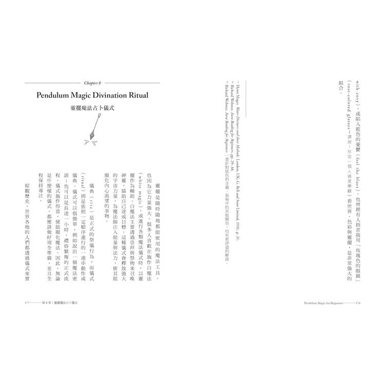 ____靈擺是隨時隨地都能使用的魔法工具,也因為它力量強大,很多人喜歡在進行各類魔法儀式時以靈擺作為輔助。本章將介紹靈擺專屬的魔法儀式,這是任何人都可以做的簡單儀式,將支持你以靈擺進行占卜、帶來祝福,並提升準確度。