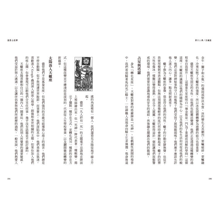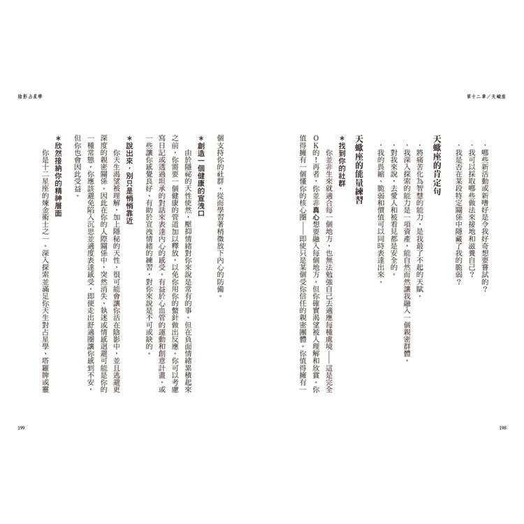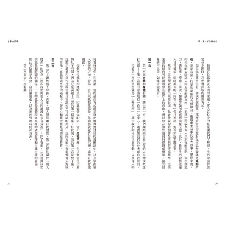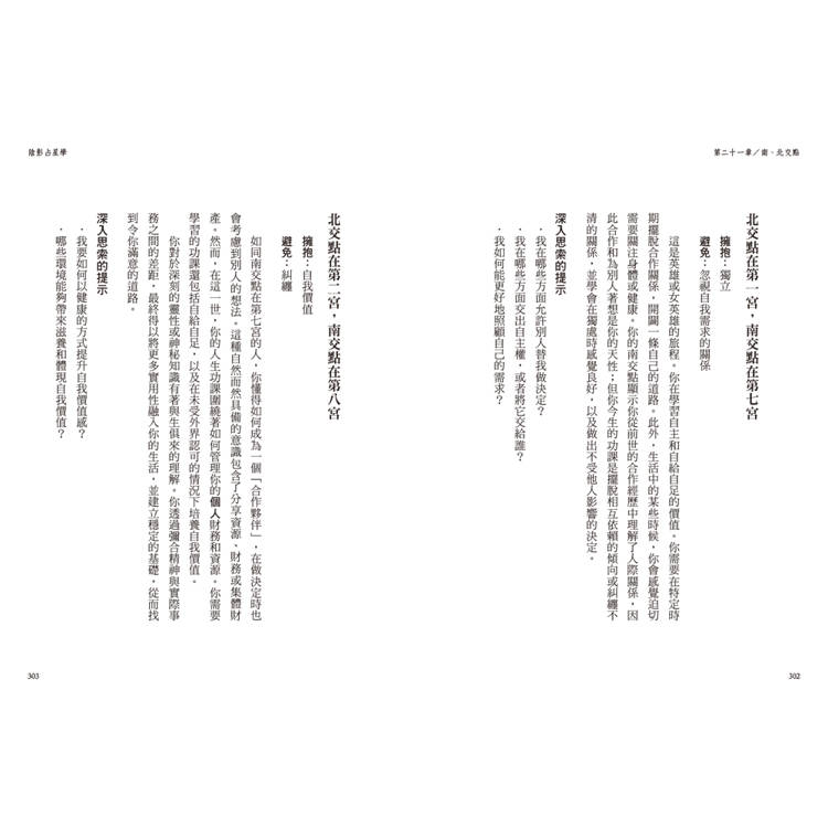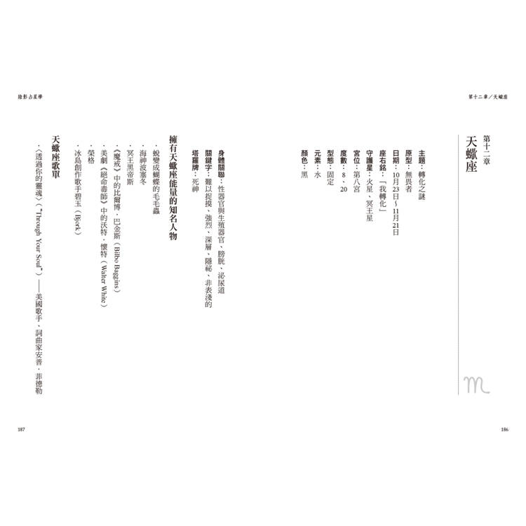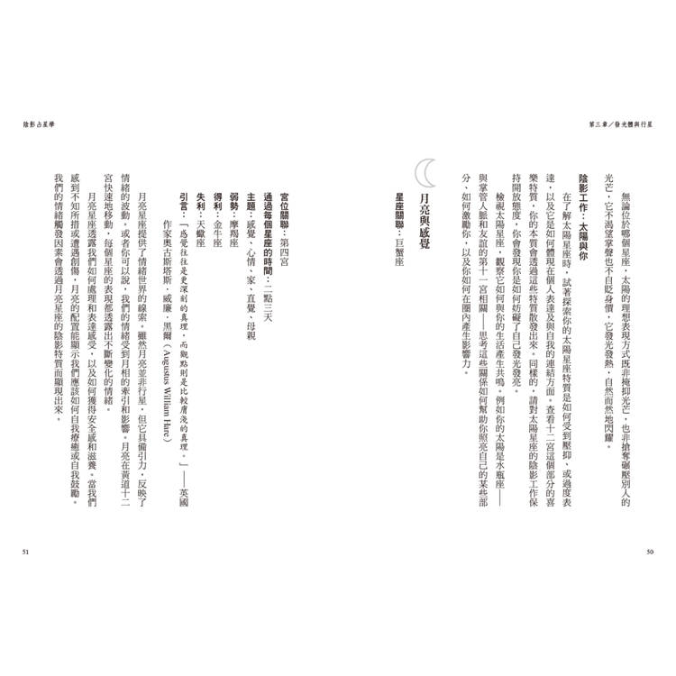 星盤上的「陰影」包括了困難相位、行星陷落、特殊星體(木星、冥王、凱龍和南北交)等,本書依照十二星座的順序提出各種組合下的心靈箴言、關係建議、重要議題、欲望和創傷、天賦和陷阱等,將宇宙語言轉化為條理明確的訊息,讓你擺脫無意識的壓抑或逃避,擁抱完整的自己。