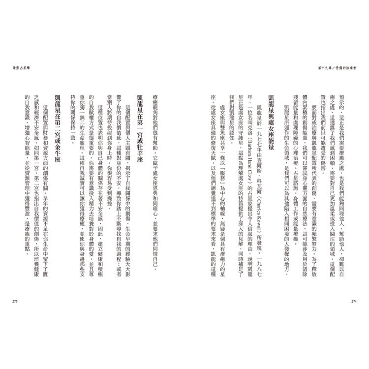 此外,除了占星體系,本書藉由對應塔羅牌、水晶礦物學、藥草學和能量顏色等工具,有意識地幫助你整合陰影,療癒創傷,將弱點和短板轉化為獨屬於你自身的超能力!透過星盤的指引,識別潛意識中的陰影,揭示真實的你,是尋求成長與幸福的第一步。