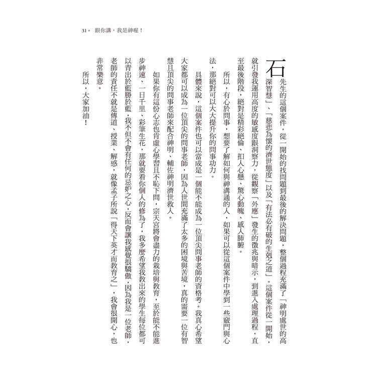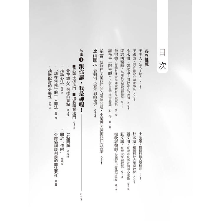 閱讀書中案例問事過程中,處處可以看到他藉由實際案例,對種子教官的殷殷叮囑與師徒間的幽默溫暖對話,期許宗天學子練就專業的問事心法。而細細咀嚼這些對話內容時,無形中也引領讀者系統思維的脈絡,閱讀起來更加緊湊與暢快!值得您品味。