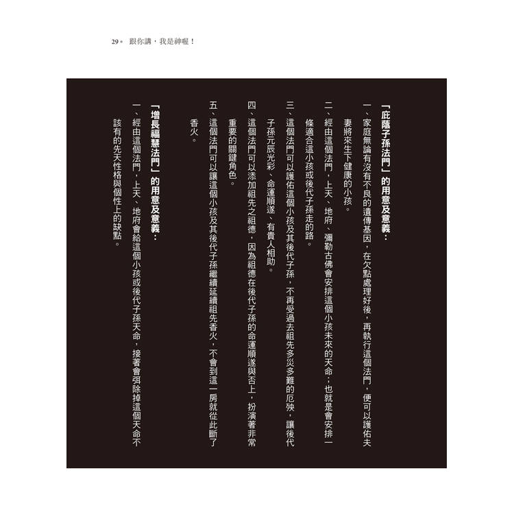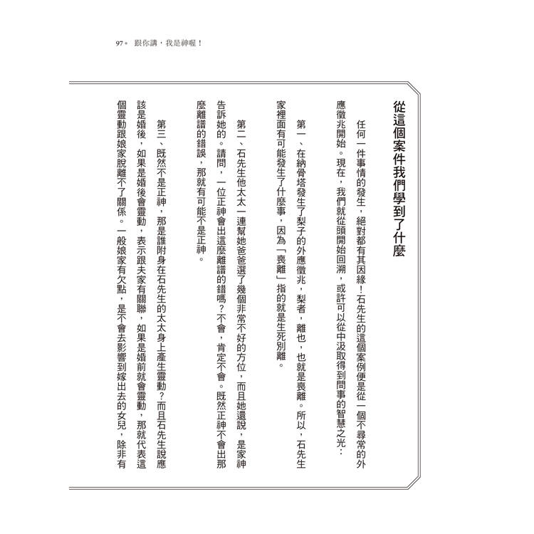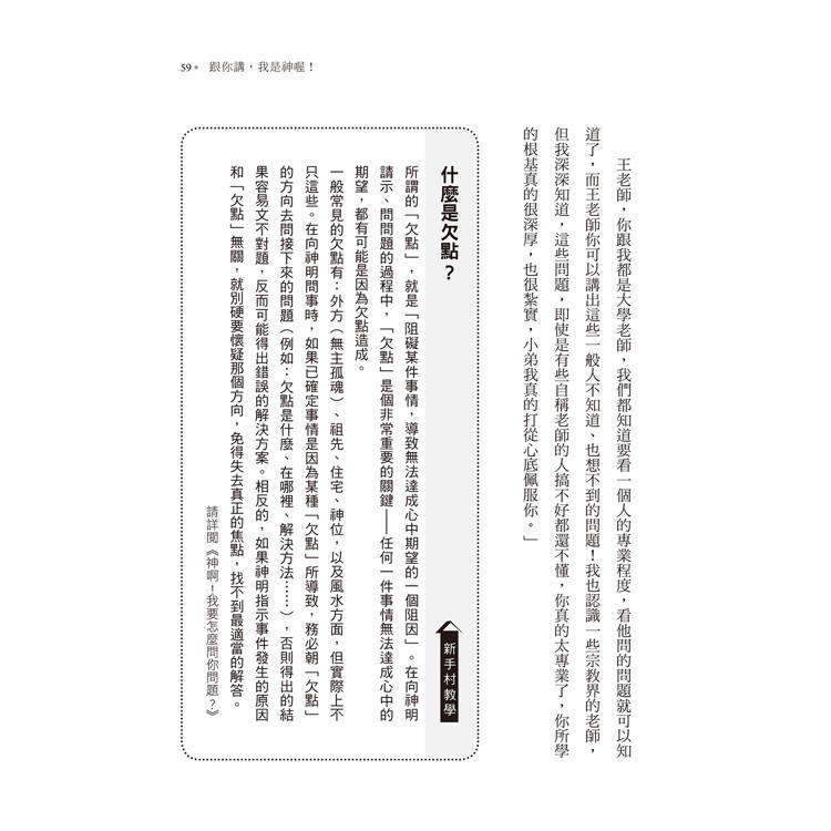 同時,書中對於王崇禮老師特別提示歸納統整問神心法,以明顯的字體呈現,讓讀者在看故事過程中,能快速抓到重點,融入於問神學習中。