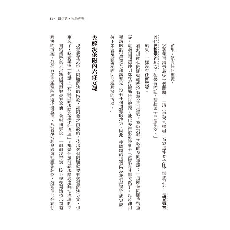 這本書真的很好看,非常好看,好看到讓我的生活作息幾天都日夜顛倒,因為我打開書一看就停不下來了。我相信大家看完這本書之後,一定也會跟我一樣對這本書愛不釋手,但我也相信,有朝一日如果大家需要擲筊請示神明,思考方式一定跟以前有很大的改變。