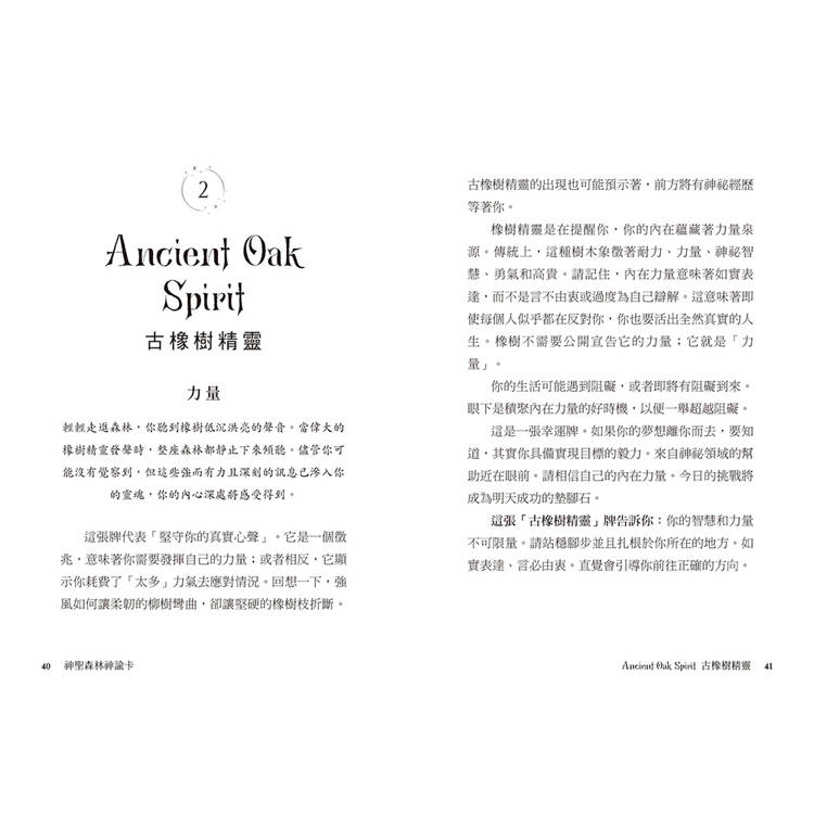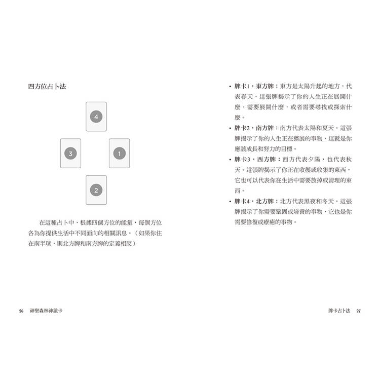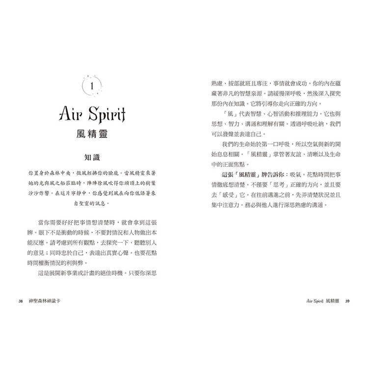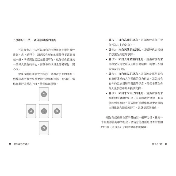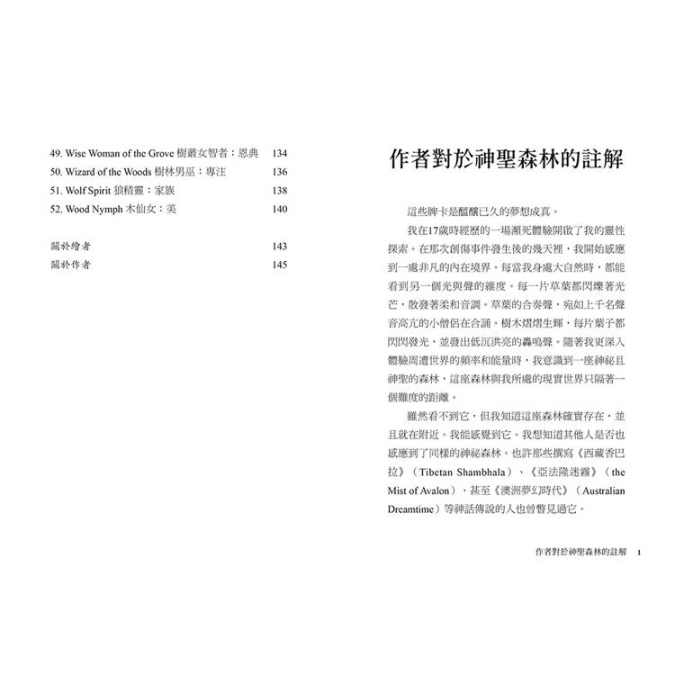 ●152頁中文說明書,包含神聖森林介紹、牌卡占卜法、冥想音檔下載說明、52張牌義說明等。