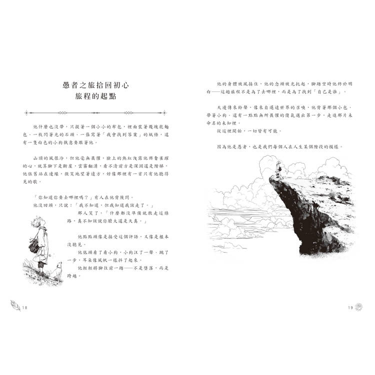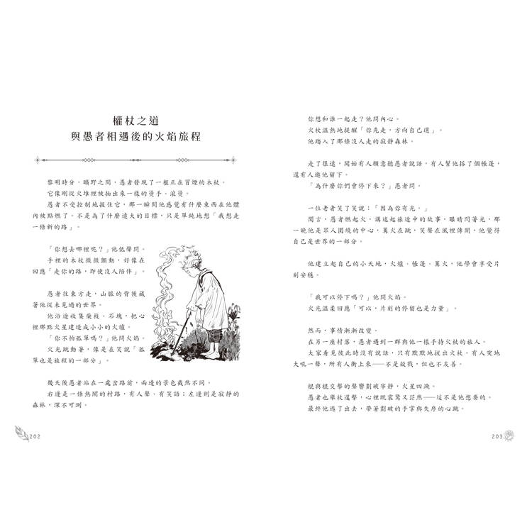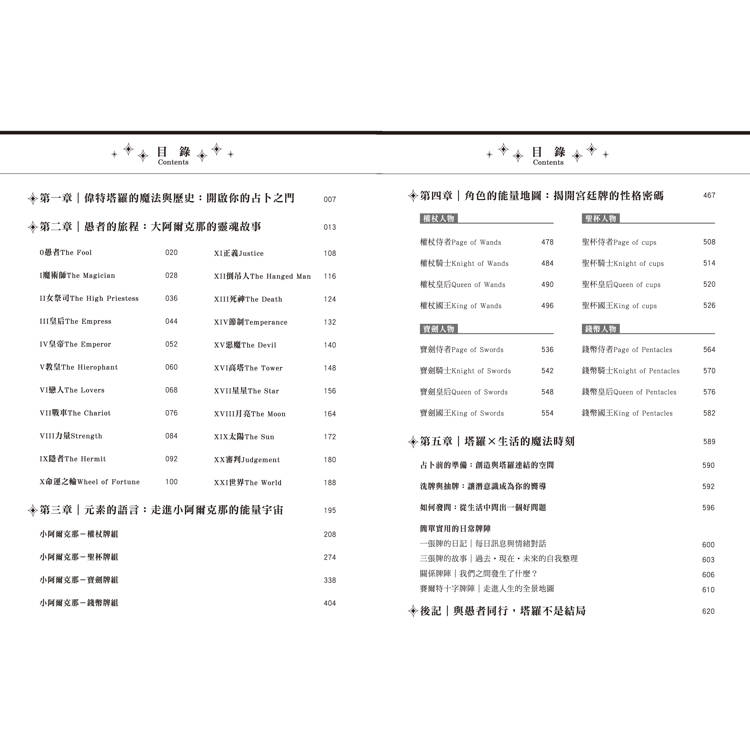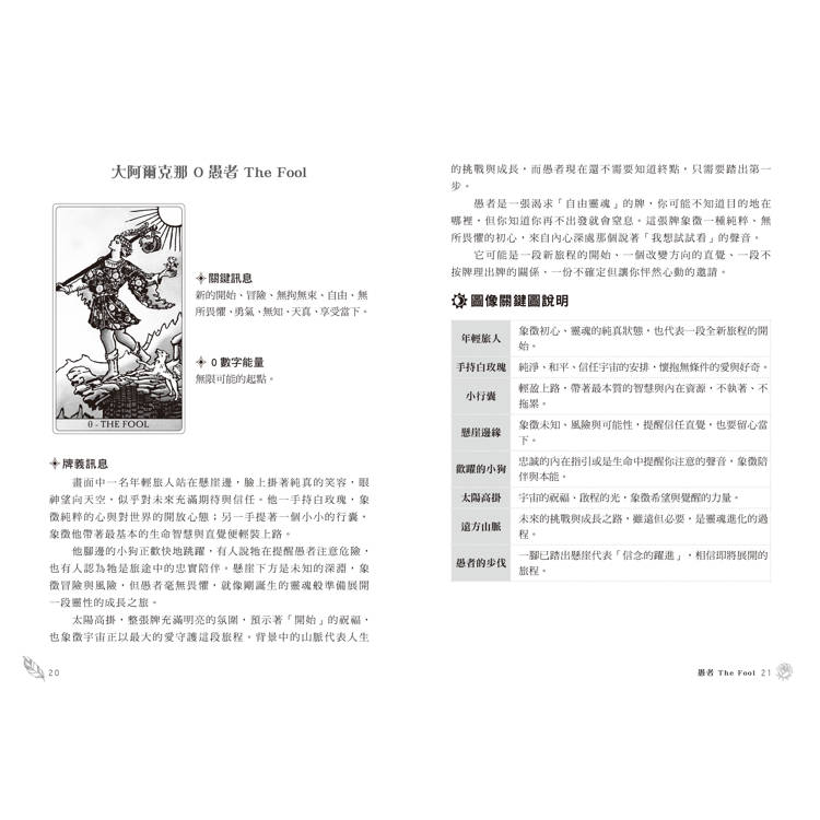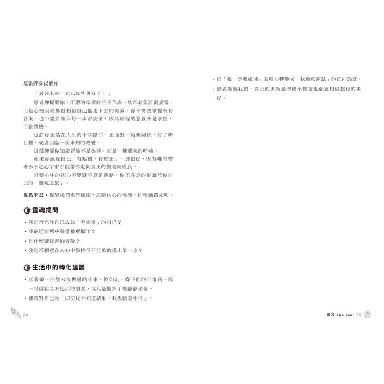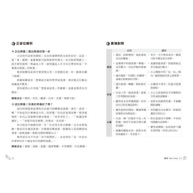 ‧本書跳脫傳統的教科書式塔羅解析,以愚者作為旅伴,帶領讀者穿越78張牌的世界。