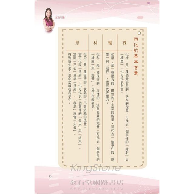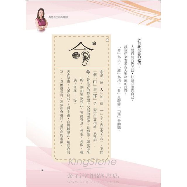 此書“做你自己的命理師系列❶“,是一本“看”與“學”兼具的書籍,意旨教大家如何掌握上天所賦予你的生命密碼,瞭解生命密碼所暗藏著的生命啟示,好讓每一個人可以更清楚瞭解各自的特質、潛能及今生使命,續而知命、掌運、趨吉避凶,自行去啟動自己的好運,掌控自己的人生。
