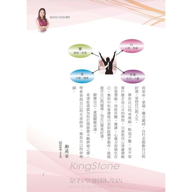 做你自己的命理師一點也不難,並不需什麽棋高八武的學問,只要從內心深處發掘自我潛能,再從外觀、健康、心靈方面強化自己,無形中你會發現只是如此簡單動作,就能提升自己的磁場,為自己帶來好運。