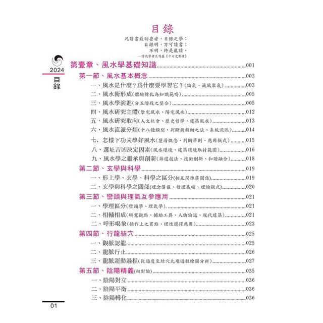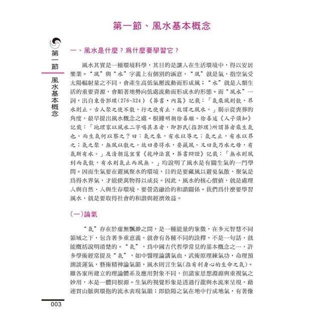 研讀先賢的風水書籍與文獻,確實深奧無比,文字深澀,歌訣不易理解,章法難明,無法捉摸,所得亦是管中窺豹。本書依據三元玄空學理解析與繪圖說明,並以多年在大學系所的教學經驗,善用現代科技作為輔助工具,打破風水與建築籓籬,活化相融合的整體意象;並改變傳統風水的操作與論述,不含宗教背景與民俗觀點,跳脫刻板制式化印象,加入豐富的插圖引述,讓讀者不會陷入天馬行空的思維中。本書提供了學理剖析、文獻回顧、流年宜忌、案例引述、吉日良辰,可作為學習入門與進階研究之參考。