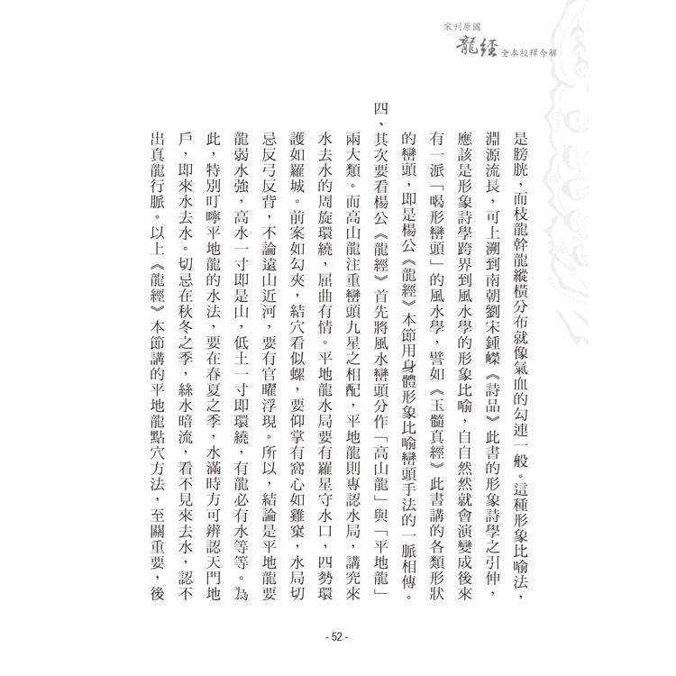 宋本《龍經》今尚庋藏於台灣「中央圖書館」善本書室,沉埋歲久,珍貴無比。今傳宋本《龍經》,整理參校,並加以己意申說,遵奉易學易理的啟發賦予《龍經》經文的現代解釋,庶幾宋本《龍經》的經文與圖例之原貌再現,提供當前風水學界的新文獻與新思考。