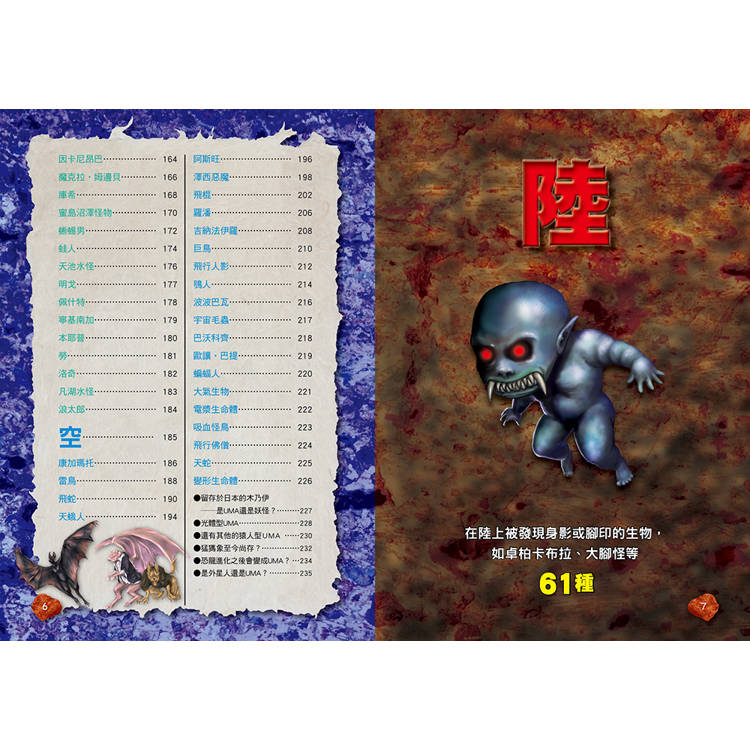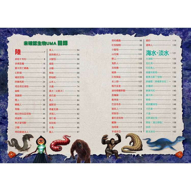 ★依照「陸地」、「海洋與淡水」、「天空」三大類型分類整理,認識不同環境中的UMA。