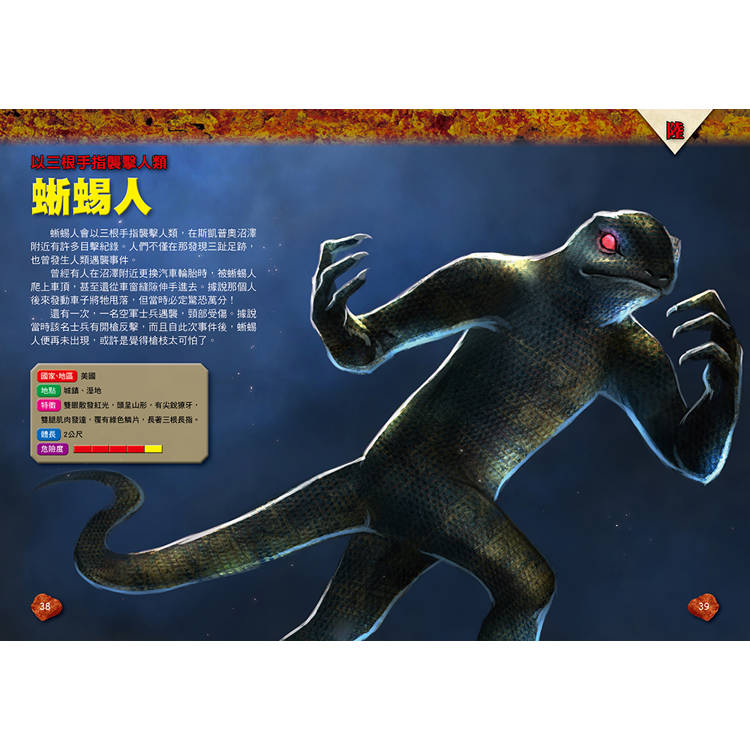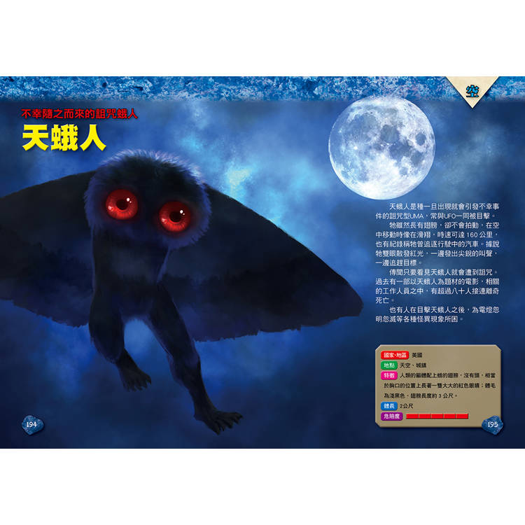 從陸地上的蜥蜴人、大腳怪,到水中的尼斯湖水怪、克拉肯,再到空中的天蛾人與澤西惡魔等神祕生物,本書收錄141種UMA。透過充滿震撼力的寫實插圖,搭配目擊地點、外型特徵與相關資料,帶領讀者一步步探索這些未確認生物背後的可能真相。