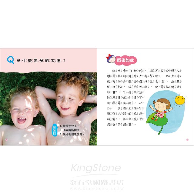 1、挑選孩子最好奇的40多個人體健康及食物的問題,列出可能的答案讓孩子動動腦,加強孩子的興趣,增加互動的樂趣。