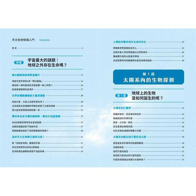 本書網羅了近年在定義廣泛的天文生物學中備受注目的幾大主題。在序章,我們將介紹天文生物學最新的熱門話題,俯瞰整個天文生物學的全貌。接著,我們會在第1部(第1章和第1章)的「太陽系內的生物探測」、第2部(第3章和第4章)的「太陽系外的生物探測」介紹各個主題的詳細內容。