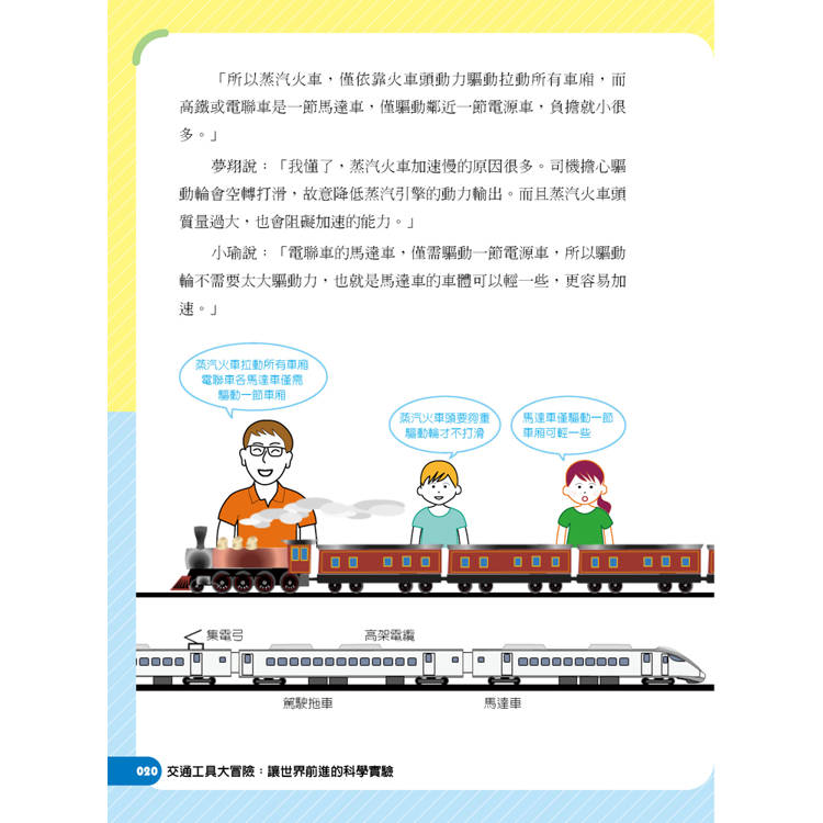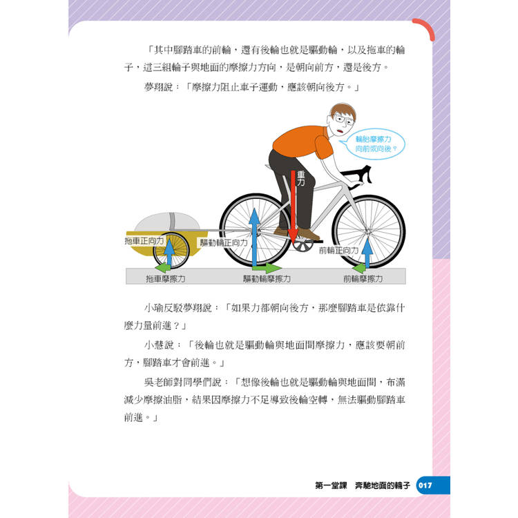 後來,為了不辜負吳老師的期望,我從前面的故事人物速寫開始讀起,進入到第一堂課〈奔馳地面的輪子〉,首先映入眼簾的,是線條乾淨俐落的吳老師騎著自行車的插畫,再來是以劇本式的多人對話作為文字內容撰述。確實,這是我熟悉的閱讀模式,於是便一步步往下看,而這一看,竟然欲罷不能。我不但看到陸、海、空各種交通工具的科學知識,在你來我往的對話中,還看到動手操作的實驗步驟、古今中外相關的探究與應用,甚至預測未來發展的可能性。例如以後氫氣飛船可能會改變成無人載具,專門運送大量貨物。又例如利用氣球進行高空發電,可以解決未來能源不足的問題等等。