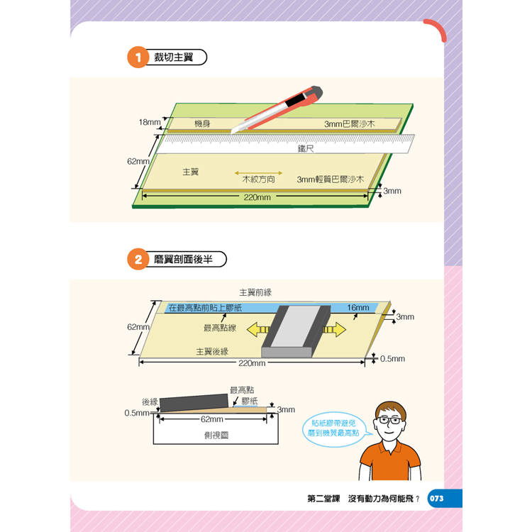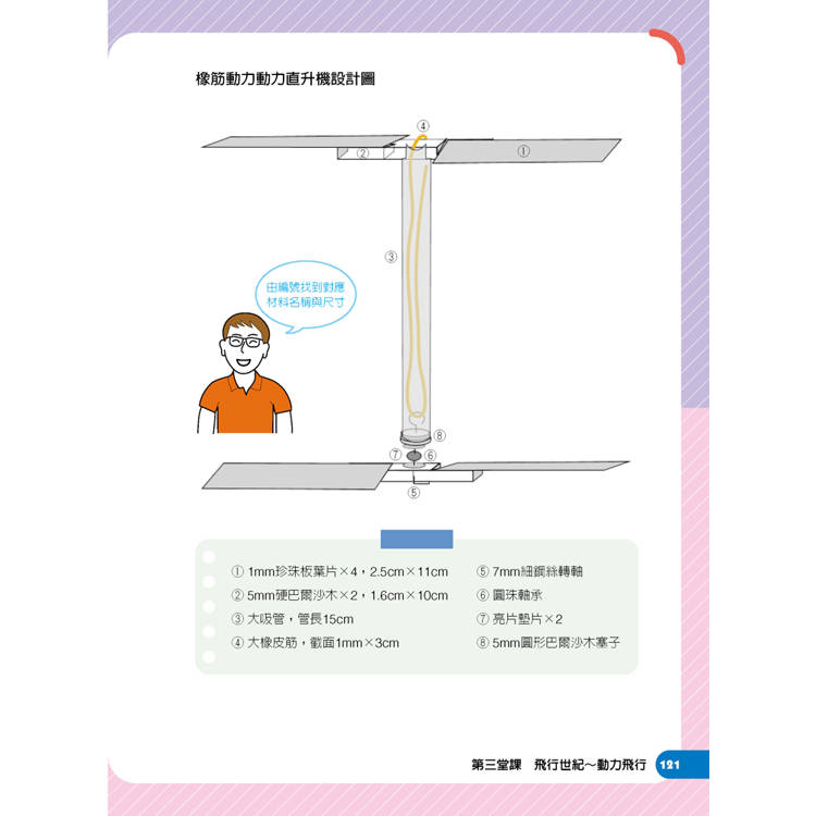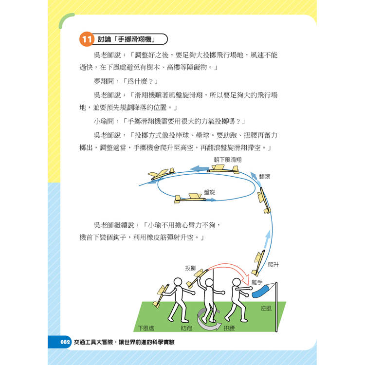 書中精心設計了幾個單元主題:在〈奔馳地面的輪子〉製作線控電動車;〈沒有動力為何能飛〉體驗手擲滑翔機;而〈飛行世紀~動力飛行〉規劃橡筋動力直升機升空;〈征服海洋的船舶〉則是計算地球的半徑;最後的〈成果發表〉製作明輪船、噗噗蒸汽船與航向燈塔的船。將科學知識學以致用,培養耐心與細心,體驗從無到有的成就感!