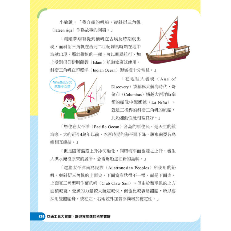 所以本書不從自然、社會作分類,不談枯燥理論。而從輪軸、飛行以及航海議題,討論創新發明科學史、車、船、飛機等主題講故事,與主題相關的議題如:利益與法令衝突、公關媒體與行銷、地理大發現、植物與材料,都是課堂中可以與同學們盡情討論的話題。當遇到問題需要知識解決時,才會適時提及原理。當然動手實作專題更是本書重點。有限的篇幅內,如何饒富趣味地陳述這些跨領域,又彼此相互關聯的知識呢?